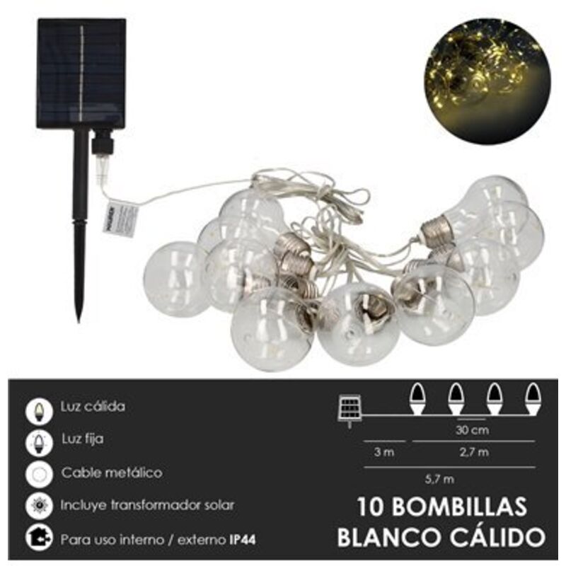 Luce Bianco Caldo - cavo trasparentelunghezza cavo alimentazione mt. 3lunghezza catena luminosa mt. 2,7 - distanza tra lampadine 30 cm.Dimensione lampadina 6 cm.5 Microled in ogni lampadinaTempo di ricarica 8 oreTempo di illuminazione 8 oreBatteria a litio ricaricabile 3,7V 1200 mAh (inclusa)Si accende al crepuscolo - Lampade non sostituibili