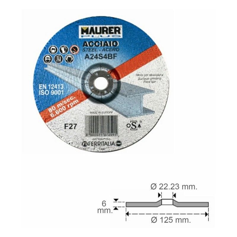 Disco di revisione abrasivo - Misure: Ø 125 x 6 x 22,23 mm. - Struttura interna in rete di fibra di vetro per una maggiore resistenza e durata. - Materie prime della migliore qualità per un uso duraturo.