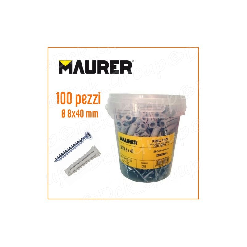 Pratica confezione con secchiello di tasselli in nylon serie MXV - MAURER Secchiello da 100 tasselli + 100 viti abbinate Diametro tassello 8 mm in nylon Lunghezza 4 cm Vite a croce da 5 cm di lunghezza in acciaio zincato Tasselli di tipo UNIVERSALE, possono essere utilizzati su calcestruzzo, pietra, gasbeton, mattone pieno, bimattone, mattone forato, cartongesso.