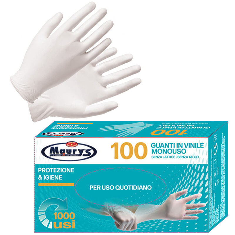 Guanti in vinile monouso adatti per tutti gli impieghi.senza lattice nè talco. Resistenti. sono indicati per uso quotidiano. Maury's Guanti Realizzati in Vinile Confezione da 100 pezzi In taglia L