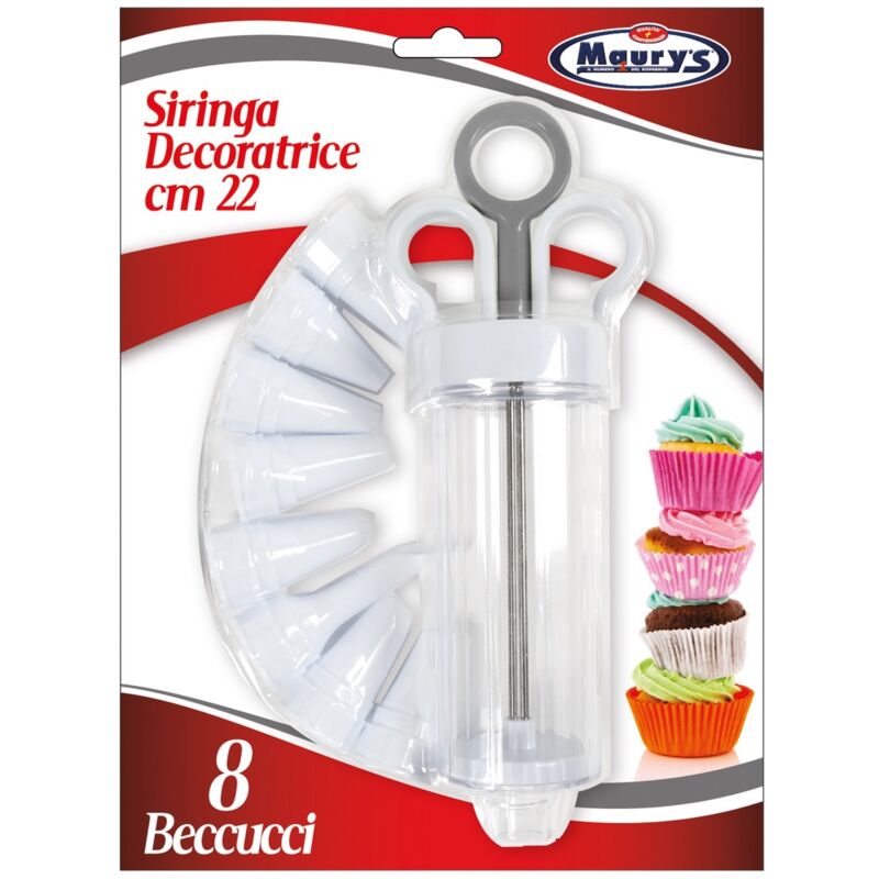 Siringa decoratrice con 8 beccucci differenti ideale per decorare torte e cupcakes. La siringa decoratrice ti permetterà di unire la bravura nella cucina alla bellezza del design estetico creando così torte non solo deliziose ma anche belle da vedere. Siringa Decoratrice Maury's Con 8 Beccucci differenti Ideale per Decorare dolci e torte Dimensioni: 22 cm Realizzata in plastica lavabile