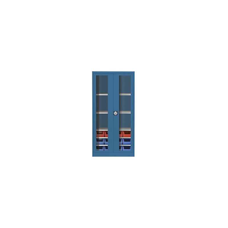 Armadio con ante a battente con finestrella, con 12 cassettine, blu brillante. Fornitura = montato. Altezza = 1950 mm. Larghezza = 950 mm. Profondità = 420 mm. Struttura = saldata. Materiale = acciaio. Superficie = verniciatura a polvere. Numero ripiani = 5 pz. Materiale ripiani = zincato. Portata per ripiano = 80 kg. Passo di regolazione altezza ripiani = 35 mm. Cassettine numero / lungh. x largh. x alt. = 8 x blu / 350x210x140 mm, 4 x rosso / 350x210x140 mm. Colore corpo = blu brillante RAL 5007. Colore porta = blu brillante RAL 5007. Tipo di porta = ante a battente con finestrella. Serratura = serratura a cilindro girevole con chiusura a triplo chiavistello, 2 chiavi incluse. Numero cassette = 12 pz. Peso = 70.53 kg. Contenuto dell'armadio ben visibile per non rimanere senza scorte. Grazie alla grande finestrella robusta, si ha una panoramica completa del materiale a disposizione che resta tuttavia al sicuro sotto chiave! Corpo Robusto corpo in acciaio saldato con verniciatura a