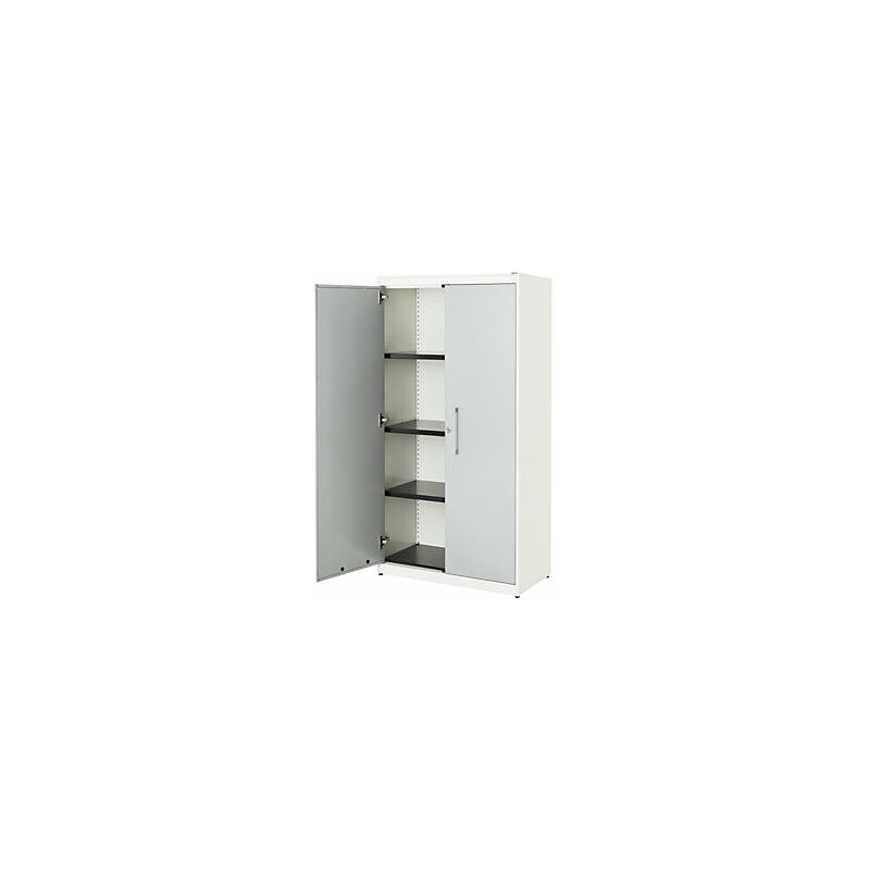 Armadio con ante a battente, alt. x largh. 1516 x 800 mm, pannello in acciaio, 3 ripiani, bianco puro / alluminio brillante / bianco puro. Fornitura = montato. Larghezza = 800 mm. Altezza = 1516 mm. Profondità = 432 mm. Colore corpo = bianco puro RAL 9010. Materiale = acciaio, verniciato a polvere. Tipo di prodotto = armadi con ante a battente. Tipo di porta = anta a battente. Colore porta = alluminio brillante RAL 9006. Numero ante = 2 pz. Numero ripiani = 3 pz. Materiale ripiani = acciaio, verniciato a polvere. Colore ripiani = nero grafite RAL 9011. Portata per ripiano = 44 kg. Caratteristiche = con serratura. Serratura = serratura a cilindro girevole con chiusura a triplo chiavistello, 2 chiavi incluse. Numero file raccoglitori = 4 pz. Dotazione interna = 3 ripiani. Angolo di apertura delle porte = 120 °. Semplice spazio per raccoglitori, documenti e materiale da ufficio. Il modello classico tra gli armadi archivio. Design minimalista. Funzionalità pratica. Corpo: robusto corpo in