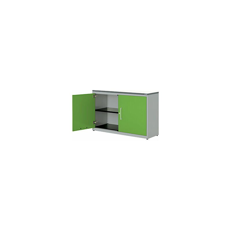 Armadio con ante a battente, alt. x largh. 830 x 1200 mm, pannello in plastica, 1 ripiano, alluminio brillante / verde limone / bianco. Fornitura = montato. Larghezza = 1200 mm. Altezza = 830 mm. Profondità = 432 mm. Colore corpo = alluminio brillante RAL 9006. Materiale = acciaio, verniciato a polvere. Tipo di prodotto = armadi con ante a battente. Tipo di porta = anta a battente. Colore porta = verde limone RAL 6018. Numero ante = 2 pz. Numero ripiani = 1 pz. Materiale ripiani = acciaio, verniciato a polvere. Colore ripiani = nero grafite RAL 9011. Portata per ripiano = 66 kg. Caratteristiche = con serratura. Serratura = serratura a cilindro girevole con chiusura a triplo chiavistello, 2 chiavi incluse. Numero file raccoglitori = 2 pz. Dotazione interna = 1 ripiano. Angolo di apertura delle porte = 120 °. Semplice spazio per raccoglitori, documenti e materiale da ufficio. Il modello classico tra gli armadi archivio. Design minimalista. Funzionalità pratica. Corpo: robusto corpo in