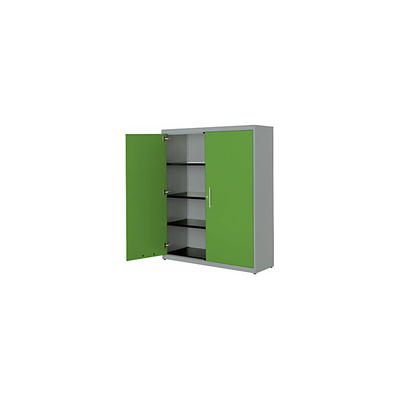 Armadio con ante a battente, alt. x largh. 1516 x 1200 mm, pannello in acciaio, 3 ripiani, alluminio brillante / verde limone / alluminio brillante. Fornitura = montato. Larghezza = 1200 mm. Altezza = 1516 mm. Profondità = 432 mm. Colore corpo = alluminio brillante RAL 9006. Materiale = acciaio, verniciato a polvere. Tipo di prodotto = armadi con ante a battente. Tipo di porta = anta a battente. Colore porta = verde limone RAL 6018. Numero ante = 2 pz. Numero ripiani = 3 pz. Materiale ripiani = acciaio, verniciato a polvere. Colore ripiani = nero grafite RAL 9011. Portata per ripiano = 66 kg. Caratteristiche = con serratura. Serratura = serratura a cilindro girevole con chiusura a triplo chiavistello, 2 chiavi incluse. Numero file raccoglitori = 4 pz. Dotazione interna = 3 ripiani. Angolo di apertura delle porte = 120 °. Semplice spazio per raccoglitori, documenti e materiale da ufficio. Il modello classico tra gli armadi archivio. Design minimalista. Funzionalità pratica. Corpo
