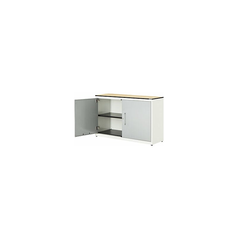 Armadio con ante a battente, alt. x largh. 818 x 1200 mm, piano in HPL con anima piena, 1 ripiano, bianco puro / alluminio brillante / acero. Fornitura = montato. Larghezza = 1200 mm. Altezza = 818 mm. Profondità = 432 mm. Colore corpo = bianco puro RAL 9010. Materiale = acciaio, verniciato a polvere. Tipo di prodotto = armadi con ante a battente. Tipo di porta = anta a battente. Colore porta = alluminio brillante RAL 9006. Numero ante = 2 pz. Numero ripiani = 1 pz. Materiale ripiani = acciaio, verniciato a polvere. Colore ripiani = nero grafite RAL 9011. Portata per ripiano = 66 kg. Caratteristiche = con serratura. Serratura = serratura a cilindro girevole con chiusura a triplo chiavistello, 2 chiavi incluse. Numero file raccoglitori = 2 pz. Dotazione interna = 1 ripiano. Angolo di apertura delle porte = 120 °. Semplice spazio per raccoglitori, documenti e materiale da ufficio. Il modello classico tra gli armadi archivio. Design minimalista. Funzionalità pratica. Corpo: robusto corpo