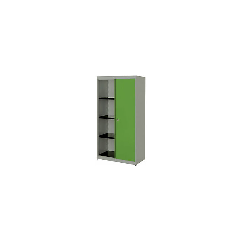 Armadio con ante scorrevoli, alt. x largh. x prof. 1516 x 800 x 432 mm, pannello in acciaio, 3 ripiani, alluminio brillante / verde limone / alluminio brillante. Fornitura = montato. Larghezza = 800 mm. Altezza = 1516 mm. Profondità = 432 mm. Colore corpo = alluminio brillante RAL 9006. Materiale = acciaio, verniciato a polvere. Tipo di prodotto = armadi con ante scorrevoli. Tipo di porta = porta scorrevole. Colore porta = verde limone RAL 6018. Numero ante = 2 pz. Numero ripiani = 3 pz. Colore ripiani = nero grafite RAL 9011. Portata per ripiano = 44 kg. Caratteristiche = con serratura. Serratura = serratura a cilindro girevole con nucleo sostituibile, 2 chiavi incluse. Numero file raccoglitori = 4 pz. Dotazione interna = 3 ripiani. Linea di armadi di qualità con numerose possibilità di allestimento. Sfruttamento ottimale degli spazi mediante varianti combinabili tra loro in modo flessibile. Design moderno dalle linee eleganti. Versione salvaspazio con ante agevolmente scorrevoli. Se