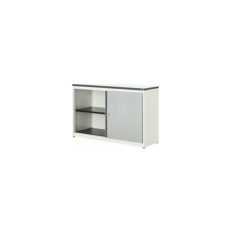 Armadio con ante scorrevoli, alt. x largh. x prof. 830 x 1200 x 432 mm, pannello in plastica, 1 ripiano, bianco puro / alluminio brillante / bianco. Fornitura = montato. Larghezza = 1200 mm. Altezza = 830 mm. Profondità = 432 mm. Colore corpo = bianco puro RAL 9010. Materiale = acciaio, verniciato a polvere. Tipo di prodotto = armadi con ante scorrevoli. Tipo di porta = porta scorrevole. Colore porta = alluminio brillante RAL 9006. Numero ante = 2 pz. Numero ripiani = 1 pz. Colore ripiani = nero grafite RAL 9011. Portata per ripiano = 66 kg. Caratteristiche = con serratura. Serratura = serratura a cilindro girevole con nucleo sostituibile, 2 chiavi incluse. Numero file raccoglitori = 2 pz. Dotazione interna = 1 ripiano. Linea di armadi di qualità con numerose possibilità di allestimento. Sfruttamento ottimale degli spazi mediante varianti combinabili tra loro in modo flessibile. Design moderno dalle linee eleganti. Versione salvaspazio con ante agevolmente scorrevoli. Se nell'ufficio