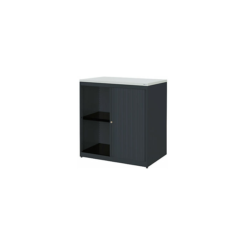 Armadio a serranda orizzontale, alt. x largh. x prof. 830 x 800 x 432 mm, pannello in plastica, 1 ripiano, grigio antracite / grigio antracite / grigio chiaro. Fornitura = montato. Altezza = 830 mm. Larghezza = 800 mm. Profondità = 432 mm. Colore corpo = grigio antracite RAL 7016. Materiale corpo = acciaio, verniciato a polvere. Colore serranda = grigio antracite RAL 7016. Caratteristiche = con serratura. Serratura = serratura a cilindro girevole con nucleo sostituibile, 2 chiavi incluse. Numero file raccoglitori = 2 pz. Materiale serranda = plastica. Dotazione interna = 1 ripiano. Numero ripiani = 1 pz. Portata per ripiano = 44 kg. Colore ripiani = nero grafite RAL 9011. Tipo di porta = serranda orizzontale. Colore piano = grigio chiaro. Passo di regolazione altezza ripiani = 25 mm. Larghezza interna = 668 mm. Altezza interna = 680 mm. Profondità interna = 368 mm. Spessore ripiani = 25 mm. Spessore del corpo = 0.75 mm. Altezza zoccolo = 50 mm. Larghezza piano = 801 mm. Salvaspazio.