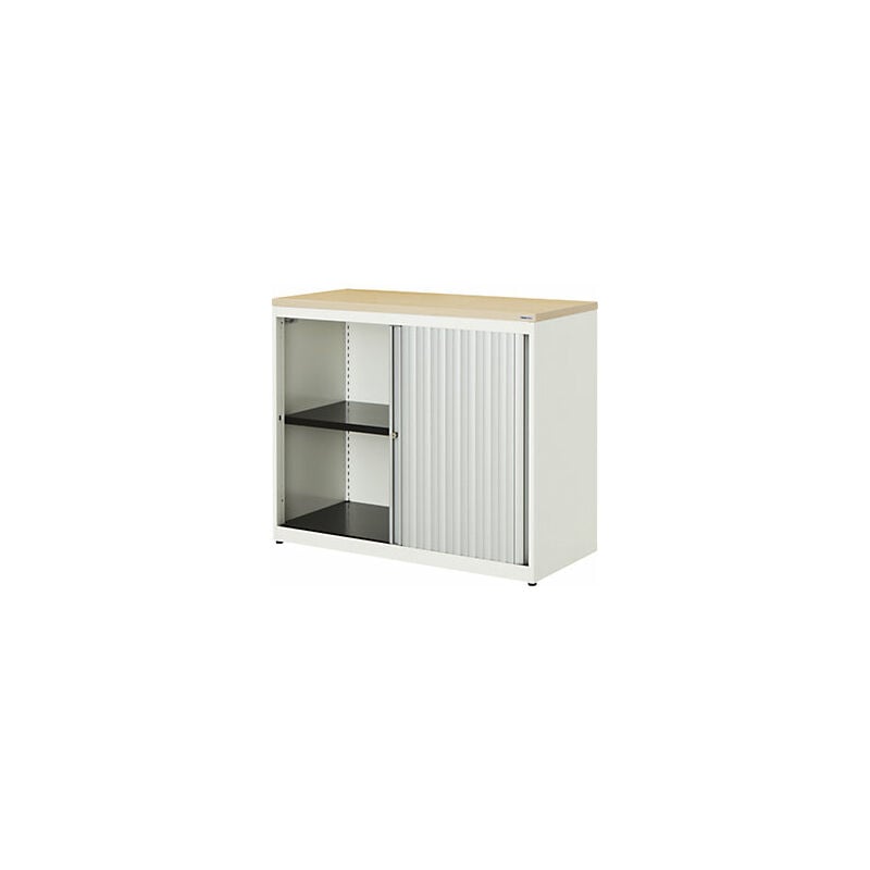 Armadio a serranda orizzontale, alt. x largh. x prof. 830 x 1000 x 432 mm, pannello in plastica, 1 ripiano, bianco puro / color alluminio / acero. Fornitura = montato. Altezza = 830 mm. Larghezza = 1000 mm. Profondità = 432 mm. Colore corpo = bianco puro RAL 9010. Materiale corpo = acciaio, verniciato a polvere. Colore serranda = alluminio brillante RAL 9006. Caratteristiche = con serratura. Serratura = serratura a cilindro girevole con nucleo sostituibile, 2 chiavi incluse. Numero file raccoglitori = 2 pz. Materiale serranda = plastica. Dotazione interna = 1 ripiano. Numero ripiani = 1 pz. Portata per ripiano = 55 kg. Colore ripiani = nero grafite RAL 9011. Tipo di porta = serranda orizzontale. Colore piano = simil-acero. Passo di regolazione altezza ripiani = 25 mm. Larghezza interna = 868 mm. Altezza interna = 680 mm. Profondità interna = 368 mm. Spessore ripiani = 25 mm. Spessore del corpo = 0.75 mm. Altezza zoccolo = 50 mm. Larghezza piano = 1001 mm. Salvaspazio. Scorrimento ante