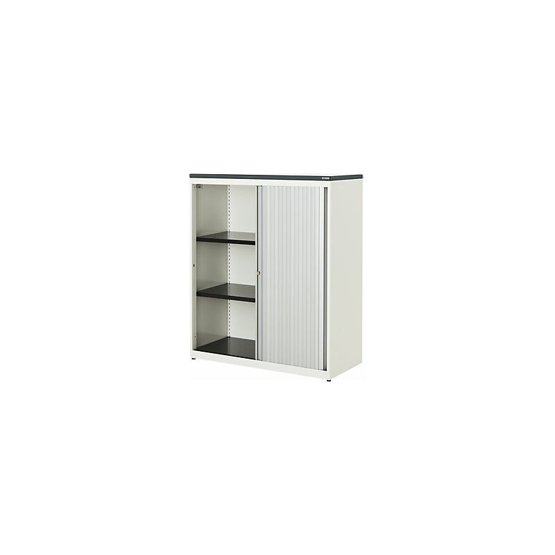 Armadio a serranda orizzontale, alt. x largh. x prof. 1180 x 1000 x 432 mm, pannello in plastica, 2 ripiani, bianco puro / color alluminio / bianco. Fornitura = montato. Altezza = 1180 mm. Larghezza = 1000 mm. Profondità = 432 mm. Colore corpo = bianco puro RAL 9010. Materiale corpo = acciaio, verniciato a polvere. Colore serranda = alluminio brillante RAL 9006. Caratteristiche = con serratura. Serratura = serratura a cilindro girevole con nucleo sostituibile, 2 chiavi incluse. Numero file raccoglitori = 3 pz. Materiale serranda = plastica. Dotazione interna = 2 ripiani. Numero ripiani = 2 pz. Portata per ripiano = 55 kg. Colore ripiani = nero grafite RAL 9011. Tipo di porta = serranda orizzontale. Colore piano = bianco. Passo di regolazione altezza ripiani = 25 mm. Larghezza interna = 868 mm. Altezza interna = 1030 mm. Profondità interna = 368 mm. Spessore ripiani = 25 mm. Spessore del corpo = 0.75 mm. Altezza zoccolo = 50 mm. Larghezza piano = 1001 mm. Salvaspazio. Scorrimento ante
