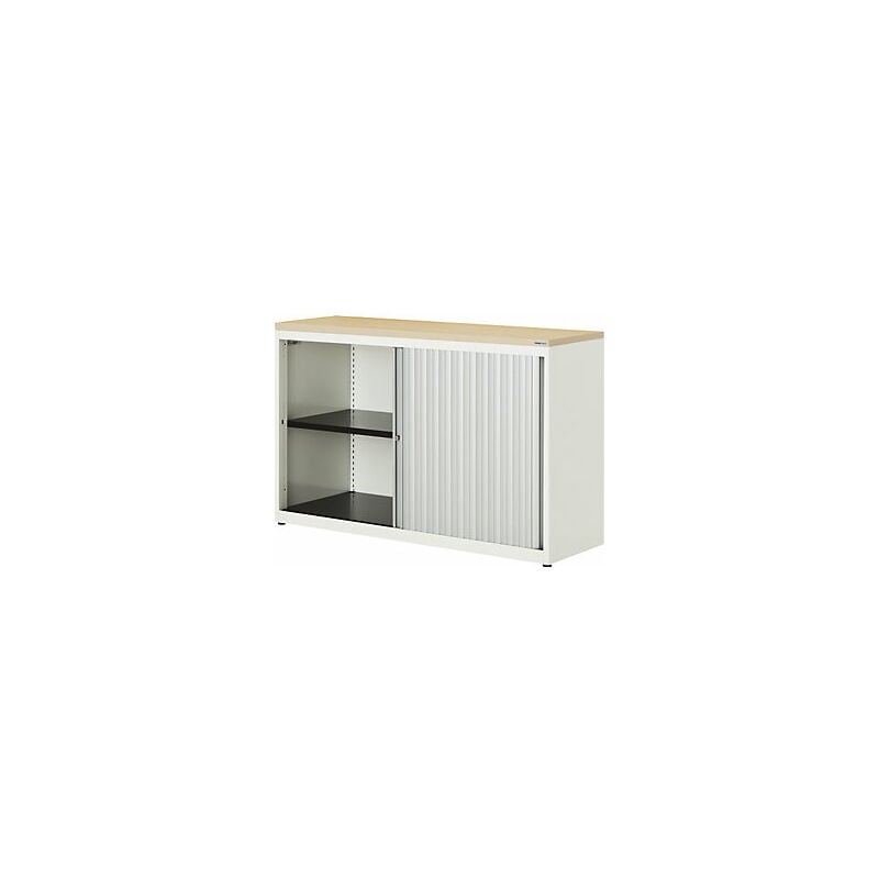 Armadio a serranda orizzontale, alt. x largh. x prof. 830 x 1200 x 432 mm, pannello in plastica, 1 ripiano, bianco puro / color alluminio / acero. Fornitura = montato. Altezza = 830 mm. Larghezza = 1200 mm. Profondità = 432 mm. Colore corpo = bianco puro RAL 9010. Materiale corpo = acciaio, verniciato a polvere. Colore serranda = alluminio brillante RAL 9006. Caratteristiche = con serratura. Serratura = serratura a cilindro girevole con nucleo sostituibile, 2 chiavi incluse. Numero file raccoglitori = 2 pz. Materiale serranda = plastica. Dotazione interna = 1 ripiano. Numero ripiani = 1 pz. Portata per ripiano = 66 kg. Colore ripiani = nero grafite RAL 9011. Tipo di porta = serranda orizzontale. Colore piano = simil-acero. Passo di regolazione altezza ripiani = 25 mm. Larghezza interna = 1040 mm. Altezza interna = 680 mm. Profondità interna = 368 mm. Spessore ripiani = 25 mm. Spessore del corpo = 0.75 mm. Altezza zoccolo = 50 mm. Larghezza piano = 1201 mm. Salvaspazio. Scorrimento ante