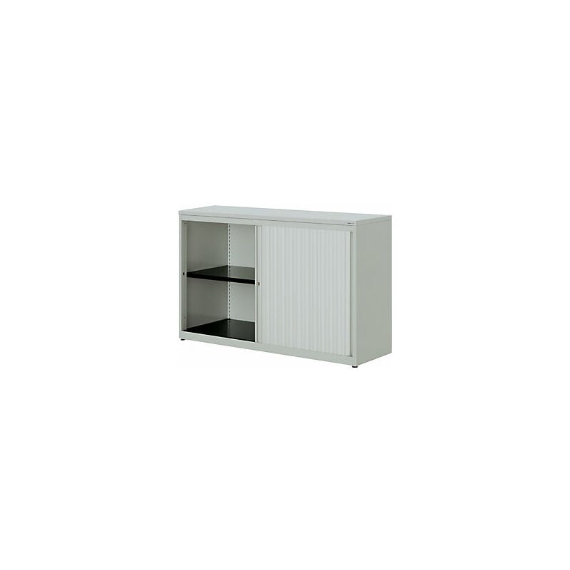 Armadio a serranda orizzontale, alt. x largh. x prof. 830 x 1200 x 432 mm, pannello in plastica, 1 ripiano, grigio chiaro / grigio chiaro / grigio chiaro. Fornitura = montato. Altezza = 830 mm. Larghezza = 1200 mm. Profondità = 432 mm. Colore corpo = grigio chiaro RAL 7035. Materiale corpo = acciaio, verniciato a polvere. Colore serranda = grigio chiaro RAL 7035. Caratteristiche = con serratura. Serratura = serratura a cilindro girevole con nucleo sostituibile, 2 chiavi incluse. Numero file raccoglitori = 2 pz. Materiale serranda = plastica. Dotazione interna = 1 ripiano. Numero ripiani = 1 pz. Portata per ripiano = 66 kg. Colore ripiani = nero grafite RAL 9011. Tipo di porta = serranda orizzontale. Colore piano = grigio chiaro. Passo di regolazione altezza ripiani = 25 mm. Larghezza interna = 1040 mm. Altezza interna = 680 mm. Profondità interna = 368 mm. Spessore ripiani = 25 mm. Spessore del corpo = 0.75 mm. Altezza zoccolo = 50 mm. Larghezza piano = 1201 mm. Salvaspazio.