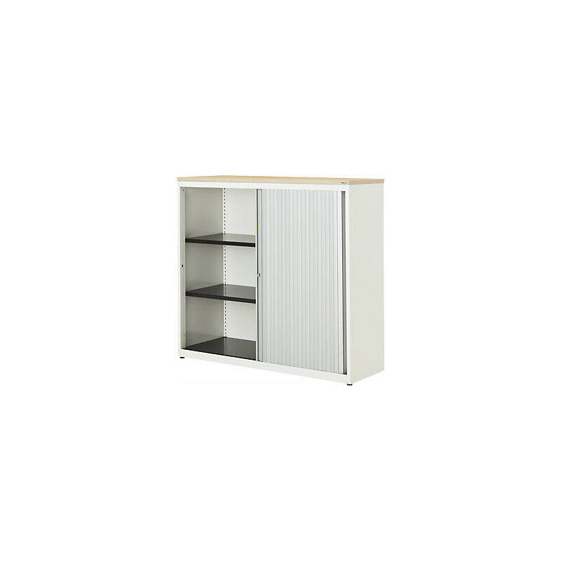Armadio a serranda orizzontale, alt. x largh. x prof. 1180 x 1200 x 432 mm, pannello in plastica, 2 ripiani, bianco puro / color alluminio / acero. Fornitura = montato. Altezza = 1180 mm. Larghezza = 1200 mm. Profondità = 432 mm. Colore corpo = bianco puro RAL 9010. Materiale corpo = acciaio, verniciato a polvere. Colore serranda = alluminio brillante RAL 9006. Caratteristiche = con serratura. Serratura = serratura a cilindro girevole con nucleo sostituibile, 2 chiavi incluse. Numero file raccoglitori = 3 pz. Materiale serranda = plastica. Dotazione interna = 2 ripiani. Numero ripiani = 2 pz. Portata per ripiano = 66 kg. Colore ripiani = nero grafite RAL 9011. Tipo di porta = serranda orizzontale. Colore piano = simil-acero. Passo di regolazione altezza ripiani = 25 mm. Larghezza interna = 1040 mm. Altezza interna = 1030 mm. Profondità interna = 368 mm. Spessore ripiani = 25 mm. Spessore del corpo = 0.75 mm. Altezza zoccolo = 50 mm. Larghezza piano = 1201 mm. Salvaspazio. Scorrimento