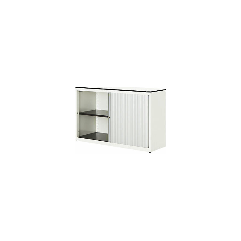 Armadio a serranda orizzontale, alt. x largh. x prof. 818 x 1200 x 432 mm, piano con anima piena, 1 ripiano, bianco puro / color alluminio / bianco. Fornitura = montato. Altezza = 818 mm. Larghezza = 1200 mm. Profondità = 432 mm. Colore corpo = bianco puro RAL 9010. Materiale corpo = acciaio, verniciato a polvere. Colore serranda = alluminio brillante RAL 9006. Caratteristiche = con serratura. Serratura = serratura a cilindro girevole con nucleo sostituibile, 2 chiavi incluse. Numero file raccoglitori = 2 pz. Materiale serranda = plastica. Dotazione interna = 1 ripiano. Numero ripiani = 1 pz. Portata per ripiano = 66 kg. Colore ripiani = nero grafite RAL 9011. Tipo di porta = serranda orizzontale. Colore piano = bianco. Passo di regolazione altezza ripiani = 25 mm. Larghezza interna = 1040 mm. Altezza interna = 680 mm. Profondità interna = 368 mm. Spessore ripiani = 25 mm. Spessore del corpo = 0.75 mm. Altezza zoccolo = 50 mm. Larghezza piano = 1201 mm. Salvaspazio. Scorrimento ante