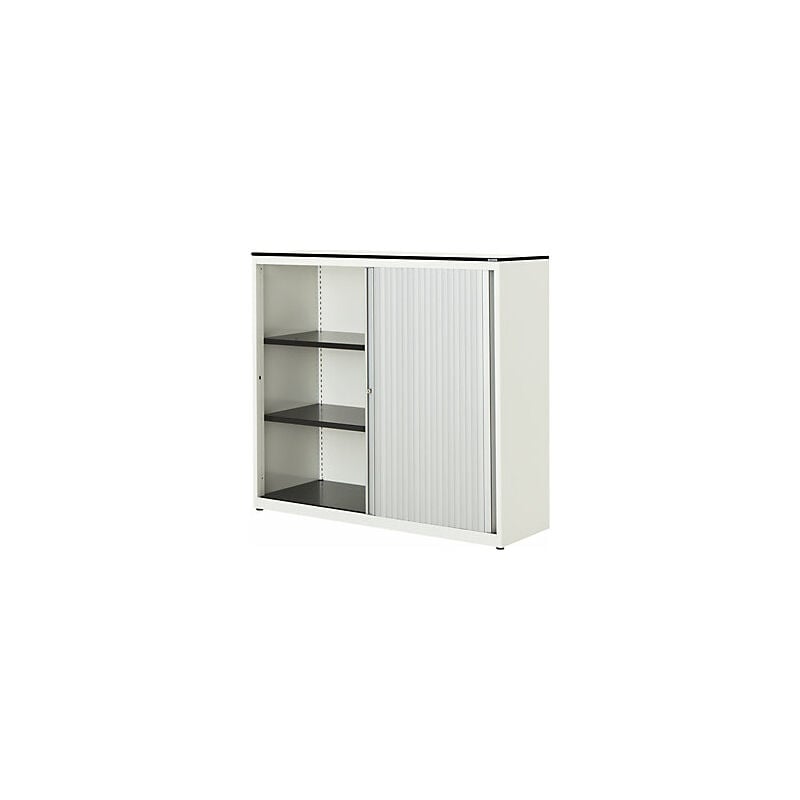 Armadio a serranda orizzontale, alt. x largh. x prof. 1168 x 1200 x 432 mm, piano con anima piena, 2 ripiani, bianco puro / color alluminio / bianco. Fornitura = montato. Altezza = 1168 mm. Larghezza = 1200 mm. Profondità = 432 mm. Colore corpo = bianco puro RAL 9010. Materiale corpo = acciaio, verniciato a polvere. Colore serranda = alluminio brillante RAL 9006. Caratteristiche = con serratura. Serratura = serratura a cilindro girevole con nucleo sostituibile, 2 chiavi incluse. Numero file raccoglitori = 3 pz. Materiale serranda = plastica. Dotazione interna = 2 ripiani. Numero ripiani = 2 pz. Portata per ripiano = 66 kg. Colore ripiani = nero grafite RAL 9011. Tipo di porta = serranda orizzontale. Colore piano = bianco. Passo di regolazione altezza ripiani = 25 mm. Larghezza interna = 1040 mm. Altezza interna = 1030 mm. Profondità interna = 368 mm. Spessore ripiani = 25 mm. Spessore del corpo = 0.75 mm. Altezza zoccolo = 50 mm. Larghezza piano = 1201 mm. Salvaspazio. Scorrimento ante