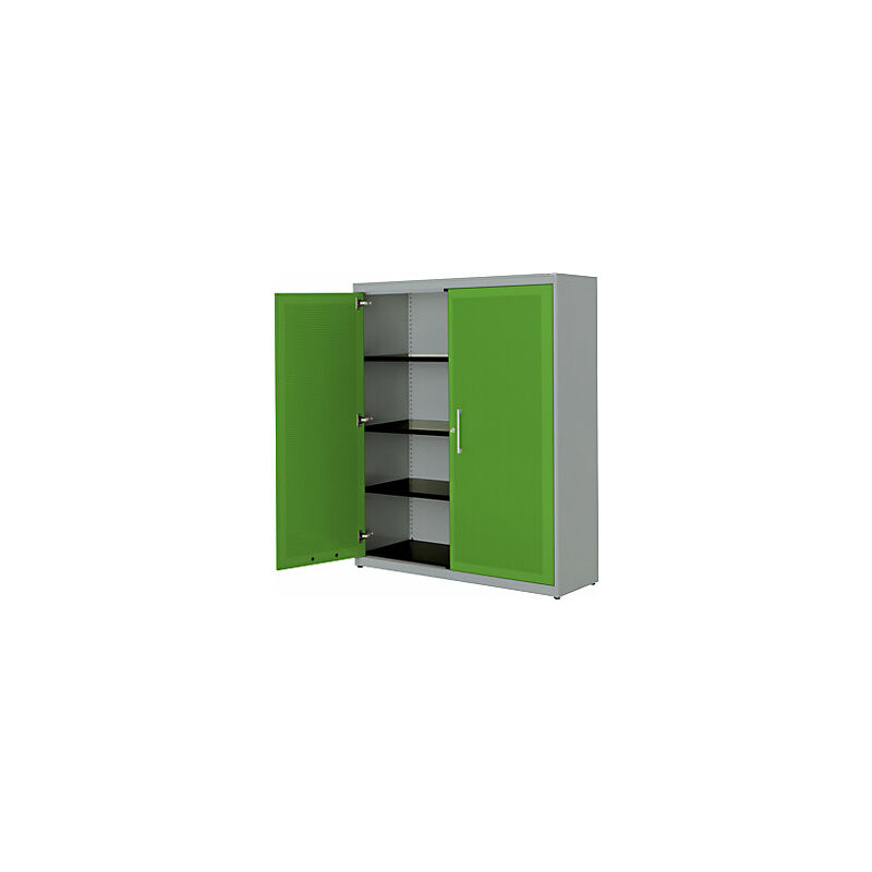 Armadio con ante a battente, con efficace assorbimento acustico, alt. x largh. x prof. 1516 x 1200 x 432 mm, 3 ripiani, alluminio brillante / verde limone. Fornitura = montato. Larghezza = 1200 mm. Altezza = 1516 mm. Profondità = 432 mm. Colore corpo = alluminio brillante RAL 9006. Materiale = acciaio, verniciato a polvere. Tipo di prodotto = armadi con ante a battente. Tipo di porta = anta a battente. Colore porta = verde limone RAL 6018. Numero ante = 2 pz. Numero ripiani = 3 pz. Materiale ripiani = acciaio, verniciato a polvere. Colore ripiani = nero grafite RAL 9011. Portata per ripiano = 66 kg. Caratteristiche = con serratura. Serratura = serratura a cilindro girevole con chiusura a triplo chiavistello, 2 chiavi incluse. Numero file raccoglitori = 4 pz. Dotazione interna = 3 ripiani. Angolo di apertura delle porte = 120 °. Semplice spazio per raccoglitori, documenti e materiale da ufficio. Il modello classico tra gli armadi archivio. Design minimalista. Funzionalità pratica.