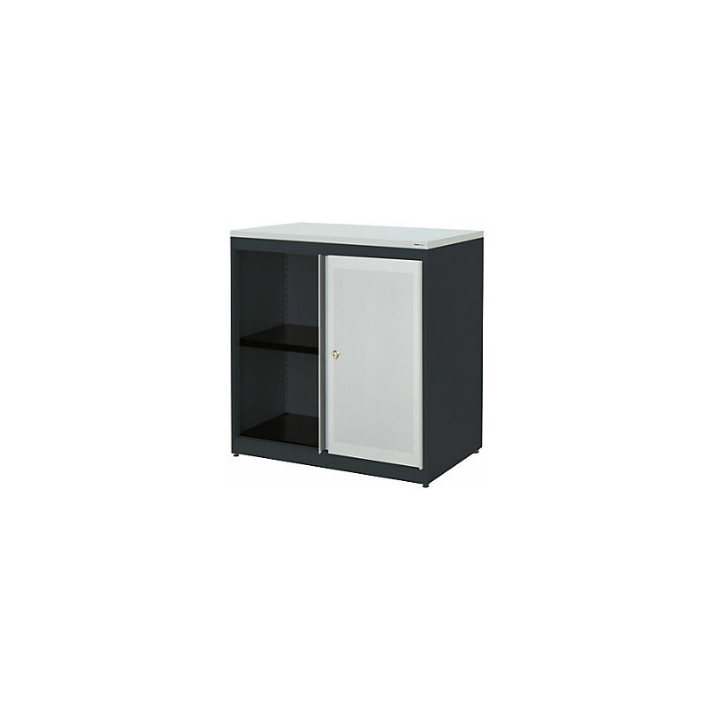 Armadio con ante scorrevoli, con efficace assorbimento acustico, pannello in plastica, alt. x largh. x prof. 830 x 800 x 432 mm, 1 ripiano, grigio antracite / grigio chiaro / grigio chiaro. Fornitura = montato. Larghezza = 800 mm. Altezza = 830 mm. Profondità = 432 mm. Colore corpo = grigio antracite RAL 7016. Materiale = acciaio, verniciato a polvere. Tipo di prodotto = armadi con ante scorrevoli. Tipo di porta = porta scorrevole. Colore porta = grigio chiaro RAL 7035. Numero ante = 2 pz. Numero ripiani = 1 pz. Colore ripiani = nero grafite RAL 9011. Portata per ripiano = 44 kg. Caratteristiche = con serratura. Serratura = serratura a cilindro girevole con nucleo sostituibile, 2 chiavi incluse. Numero file raccoglitori = 2 pz. Dotazione interna = 1 ripiano. Versione salvaspazio con ante agevolmente scorrevoli. Se nell'ufficio prevalgono aree di transito molto strette, si consiglia l'utilizzo di questo armadio. Qui nessuna anta aperta ingombrerà il passaggio. Ideale per piano