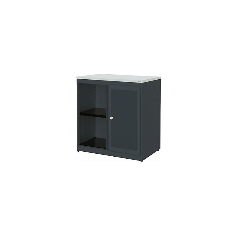 Armadio con ante scorrevoli, con efficace assorbimento acustico, pannello in plastica, alt. x largh. x prof. 830 x 800 x 432 mm, 1 ripiano, grigio antracite / grigio antracite / grigio chiaro. Fornitura = montato. Larghezza = 800 mm. Altezza = 830 mm. Profondità = 432 mm. Colore corpo = grigio antracite RAL 7016. Materiale = acciaio, verniciato a polvere. Tipo di prodotto = armadi con ante scorrevoli. Tipo di porta = porta scorrevole. Colore porta = grigio antracite RAL 7016. Numero ante = 2 pz. Numero ripiani = 1 pz. Colore ripiani = nero grafite RAL 9011. Portata per ripiano = 44 kg. Caratteristiche = con serratura. Serratura = serratura a cilindro girevole con nucleo sostituibile, 2 chiavi incluse. Numero file raccoglitori = 2 pz. Dotazione interna = 1 ripiano. Versione salvaspazio con ante agevolmente scorrevoli. Se nell'ufficio prevalgono aree di transito molto strette, si consiglia l'utilizzo di questo armadio. Qui nessuna anta aperta ingombrerà il passaggio. Ideale per piano