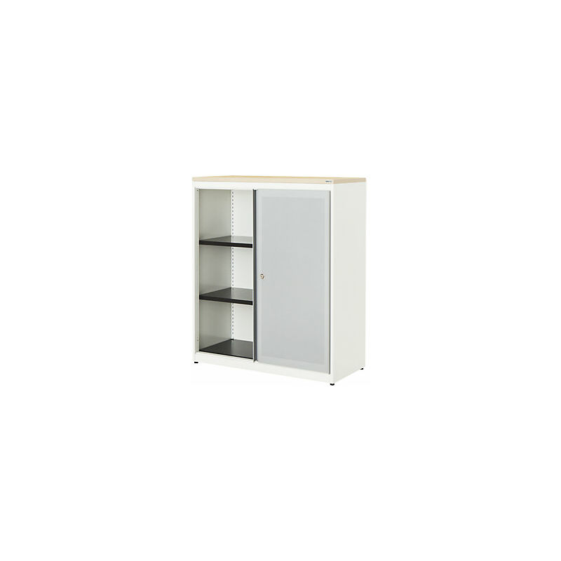 Armadio con ante scorrevoli, con efficace assorbimento acustico, pannello in plastica, alt. x largh. x prof. 1180 x 1000 x 432 mm, 2 ripiani, bianco puro / alluminio brillante / acero. Fornitura = montato. Larghezza = 1000 mm. Altezza = 1180 mm. Profondità = 432 mm. Colore corpo = bianco puro RAL 9010. Materiale = acciaio, verniciato a polvere. Tipo di prodotto = armadi con ante scorrevoli. Tipo di porta = porta scorrevole. Colore porta = alluminio brillante RAL 9006. Numero ante = 2 pz. Numero ripiani = 2 pz. Colore ripiani = nero grafite RAL 9011. Portata per ripiano = 55 kg. Caratteristiche = con serratura. Serratura = serratura a cilindro girevole con nucleo sostituibile, 2 chiavi incluse. Numero file raccoglitori = 3 pz. Dotazione interna = 2 ripiani. Versione salvaspazio con ante agevolmente scorrevoli. Se nell'ufficio prevalgono aree di transito molto strette, si consiglia l'utilizzo di questo armadio. Qui nessuna anta aperta ingombrerà il passaggio. Ideale per piano d'appoggio