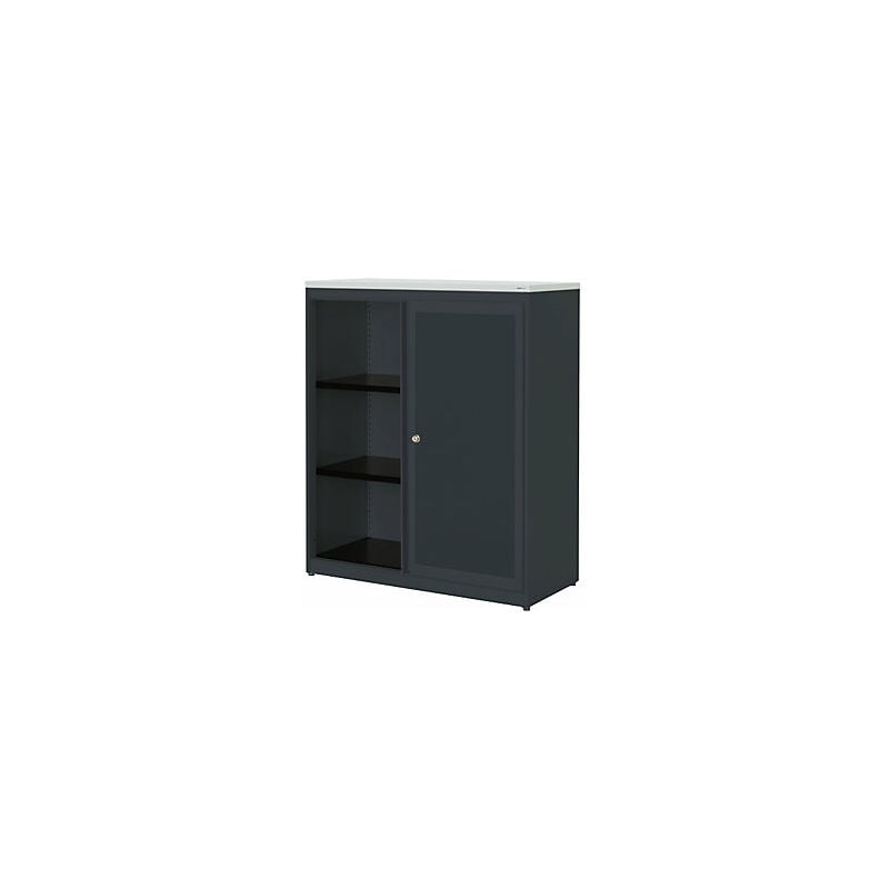 Armadio con ante scorrevoli, con efficace assorbimento acustico, pannello in plastica, alt. x largh. x prof. 1180 x 1000 x 432 mm, 2 ripiani, grigio antracite / grigio antracite / grigio chiaro. Fornitura = montato. Larghezza = 1000 mm. Altezza = 1180 mm. Profondità = 432 mm. Colore corpo = grigio antracite RAL 7016. Materiale = acciaio, verniciato a polvere. Tipo di prodotto = armadi con ante scorrevoli. Tipo di porta = porta scorrevole. Colore porta = grigio antracite RAL 7016. Numero ante = 2 pz. Numero ripiani = 2 pz. Colore ripiani = nero grafite RAL 9011. Portata per ripiano = 55 kg. Caratteristiche = con serratura. Serratura = serratura a cilindro girevole con nucleo sostituibile, 2 chiavi incluse. Numero file raccoglitori = 3 pz. Dotazione interna = 2 ripiani. Versione salvaspazio con ante agevolmente scorrevoli. Se nell'ufficio prevalgono aree di transito molto strette, si consiglia l'utilizzo di questo armadio. Qui nessuna anta aperta ingombrerà il passaggio. Ideale per piano