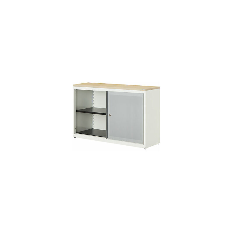 Armadio con ante scorrevoli, con efficace assorbimento acustico, pannello in plastica, alt. x largh. x prof. 830 x 1200 x 432 mm, 1 ripiano, bianco puro / alluminio brillante / acero. Fornitura = montato. Larghezza = 1200 mm. Altezza = 830 mm. Profondità = 432 mm. Colore corpo = bianco puro RAL 9010. Materiale = acciaio, verniciato a polvere. Tipo di prodotto = armadi con ante scorrevoli. Tipo di porta = porta scorrevole. Colore porta = alluminio brillante RAL 9006. Numero ante = 2 pz. Numero ripiani = 1 pz. Colore ripiani = nero grafite RAL 9011. Portata per ripiano = 66 kg. Caratteristiche = con serratura. Serratura = serratura a cilindro girevole con nucleo sostituibile, 2 chiavi incluse. Numero file raccoglitori = 2 pz. Dotazione interna = 1 ripiano. Versione salvaspazio con ante agevolmente scorrevoli. Se nell'ufficio prevalgono aree di transito molto strette, si consiglia l'utilizzo di questo armadio. Qui nessuna anta aperta ingombrerà il passaggio. Ideale per piano d'appoggio