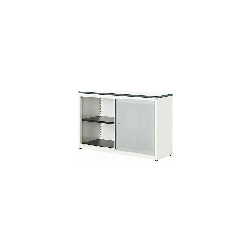 Armadio con ante scorrevoli, con efficace assorbimento acustico, pannello in plastica, alt. x largh. x prof. 830 x 1200 x 432 mm, 1 ripiano, bianco puro / alluminio brillante / bianco. Fornitura = montato. Larghezza = 1200 mm. Altezza = 830 mm. Profondità = 432 mm. Colore corpo = bianco puro RAL 9010. Materiale = acciaio, verniciato a polvere. Tipo di prodotto = armadi con ante scorrevoli. Tipo di porta = porta scorrevole. Colore porta = alluminio brillante RAL 9006. Numero ante = 2 pz. Numero ripiani = 1 pz. Colore ripiani = nero grafite RAL 9011. Portata per ripiano = 66 kg. Caratteristiche = con serratura. Serratura = serratura a cilindro girevole con nucleo sostituibile, 2 chiavi incluse. Numero file raccoglitori = 2 pz. Dotazione interna = 1 ripiano. Versione salvaspazio con ante agevolmente scorrevoli. Se nell'ufficio prevalgono aree di transito molto strette, si consiglia l'utilizzo di questo armadio. Qui nessuna anta aperta ingombrerà il passaggio. Ideale per piano d'appoggio
