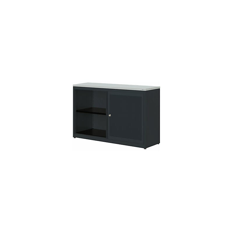 Armadio con ante scorrevoli, con efficace assorbimento acustico, pannello in plastica, alt. x largh. x prof. 830 x 1200 x 432 mm, 1 ripiano, grigio antracite / grigio antracite / grigio chiaro. Fornitura = montato. Larghezza = 1200 mm. Altezza = 830 mm. Profondità = 432 mm. Colore corpo = grigio antracite RAL 7016. Materiale = acciaio, verniciato a polvere. Tipo di prodotto = armadi con ante scorrevoli. Tipo di porta = porta scorrevole. Colore porta = grigio antracite RAL 7016. Numero ante = 2 pz. Numero ripiani = 1 pz. Colore ripiani = nero grafite RAL 9011. Portata per ripiano = 66 kg. Caratteristiche = con serratura. Serratura = serratura a cilindro girevole con nucleo sostituibile, 2 chiavi incluse. Numero file raccoglitori = 2 pz. Dotazione interna = 1 ripiano. Versione salvaspazio con ante agevolmente scorrevoli. Se nell'ufficio prevalgono aree di transito molto strette, si consiglia l'utilizzo di questo armadio. Qui nessuna anta aperta ingombrerà il passaggio. Ideale per piano