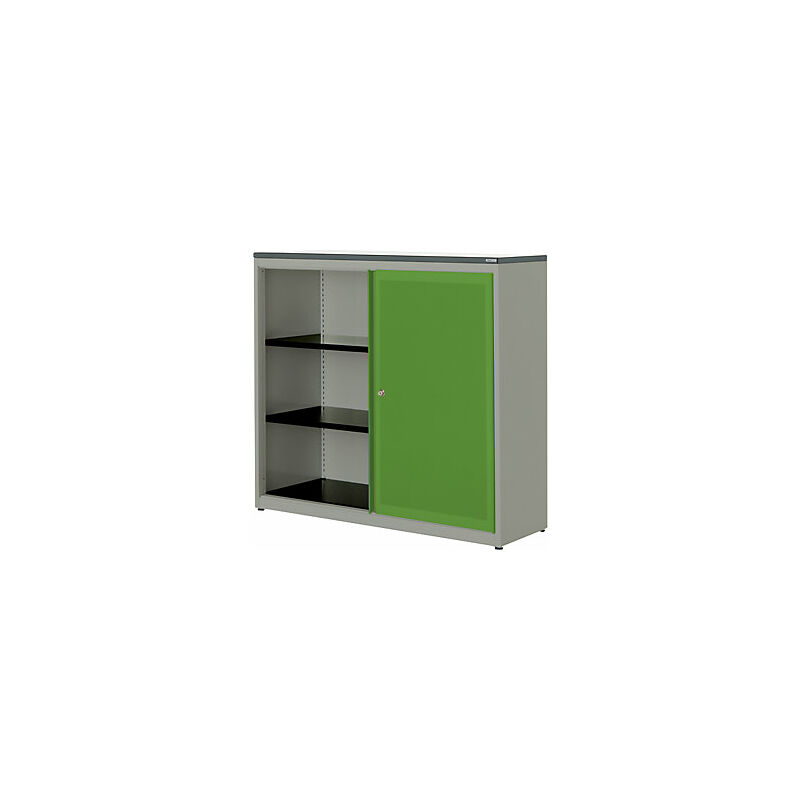 Armadio con ante scorrevoli, con efficace assorbimento acustico, pannello in plastica, alt. x largh. x prof. 1180 x 1200 x 432 mm, 2 ripiani, alluminio brillante / verde limone / bianco. Fornitura = montato. Larghezza = 1200 mm. Altezza = 1180 mm. Profondità = 432 mm. Colore corpo = alluminio brillante RAL 9006. Materiale = acciaio, verniciato a polvere. Tipo di prodotto = armadi con ante scorrevoli. Tipo di porta = porta scorrevole. Colore porta = verde limone RAL 6018. Numero ante = 2 pz. Numero ripiani = 2 pz. Colore ripiani = nero grafite RAL 9011. Portata per ripiano = 66 kg. Caratteristiche = con serratura. Serratura = serratura a cilindro girevole con nucleo sostituibile, 2 chiavi incluse. Numero file raccoglitori = 3 pz. Dotazione interna = 2 ripiani. Versione salvaspazio con ante agevolmente scorrevoli. Se nell'ufficio prevalgono aree di transito molto strette, si consiglia l'utilizzo di questo armadio. Qui nessuna anta aperta ingombrerà il passaggio. Ideale per piano