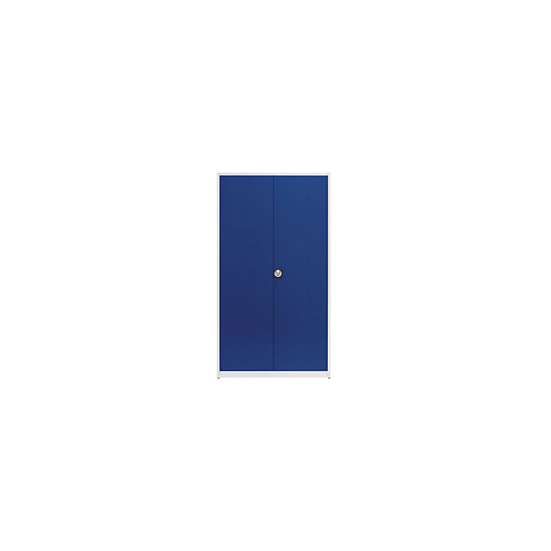 Armadio universale, extra alto, alt. x largh. x prof. 2200 x 1200 x 420 mm, grigio chiaro / blu oltremare. Fornitura = montato. Larghezza = 1200 mm. Altezza = 2200 mm. Profondità = 420 mm. Colore corpo = grigio chiaro RAL 7035. Materiale = lamiera d'acciaio, verniciata a polvere. Tipo di prodotto = armadi con ante a battente. Tipo di porta = anta a battente. Colore porta = blu oltremare RAL 5002. Numero ripiani = 5 pz. Colore ripiani = nero grafite RAL 9011. Portata per ripiano = 60 kg. Serratura = serratura di sicurezza a cilindro con nucleo sostituibile, 2 chiavi incluse. Dotazione interna = 5 ripiani. Passo di regolazione altezza ripiani = 35 mm. Altezza zoccolo = 75 mm. Angolo di apertura delle porte = 135 °. Spessore del corpo = 0.8 mm. Corpo in lamiera d'acciaio spessa 0,8 mm, saldata e verniciata a polvere. Ante antisvergolamento con rinforzo scatolato. Piedini regolabili in altezza per compensare le irregolarità della superficie d'appoggio. Cinque ripiani nero grafite