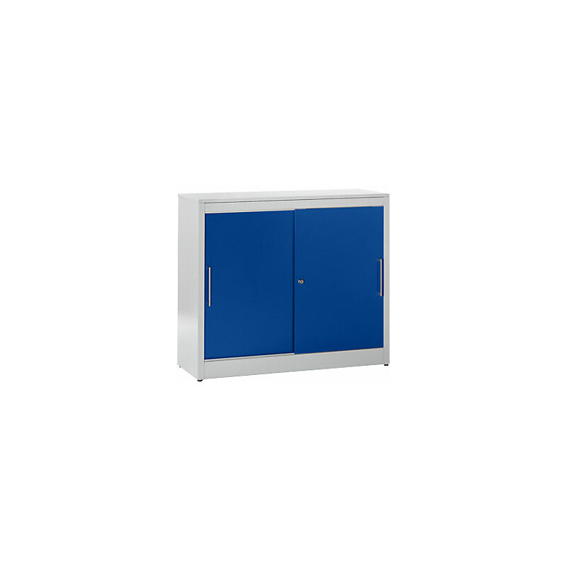 Armadio con ante scorrevoli, mobiletto con 2 ripiani, alt. x largh. x prof. 1040 x 1200 x 420 mm, grigio chiaro / blu oltremare. Fornitura = montato. Larghezza = 1200 mm. Altezza = 1040 mm. Profondità = 420 mm. Colore corpo = grigio chiaro RAL 7035. Materiale = lamiera d'acciaio, con verniciatura a forno. Tipo di prodotto = armadi con ante scorrevoli. Tipo di porta = porta scorrevole. Colore porta = blu oltremare RAL 5002. Numero ante = 2 pz. Numero ripiani = 2 pz. Materiale ripiani = lamiera d'acciaio, con verniciatura a forno. Colore ripiani = nero grafite RAL 9011. Portata per ripiano = 50 kg. Caratteristiche = con serratura. Serratura = serratura a cilindro girevole con nucleo sostituibile, 2 chiavi incluse. Numero file raccoglitori = 2.5 pz. Dotazione interna = 2 ripiani. Passo di regolazione altezza ripiani = 25 mm. Altezza zoccolo = 100 mm. Spessore del corpo = 0.8 mm. Sfruttamento ottimale dello spazio in ufficio grazie alle pratiche ante scorrevoli. Struttura in lamiera
