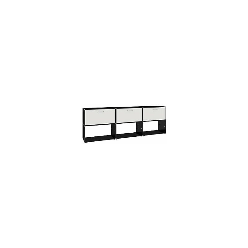 Mobile basso, 3 ante a ribalta per vano bar, 3 scaffali, nero notte / bianco segnaletico. Fornitura = in parte smontato. Larghezza = 2310 mm. Altezza = 875 mm. Profondità = 385 mm. Colore corpo = nero notte RAL 9005. Materiale = acciaio. Tipo di prodotto = mobili bassi con ante a ribalta. Tipo di porta = ribaltina frontale. Colore porta = bianco segnaletico RAL 9003. Numero ante = 3 pz. Numero file raccoglitori = 2 pz. element.x è un sistema di stoccaggio modulare estremamente innovativo per organizzare, mettere via e presentare. È un sistema molto versatile per la zona living, la casa o l'ufficio. Verniciatura a polvere di alta qualità. Design elegante grazie ai listelli angolari cromati. Elegante mobiletto con 3 grandi elementi senza parete posteriore e 3 vani bar. Gli elementi aperti offrono molta visibilità sui prodotti o sugli oggetti da esporre da due lati. I vani bar offrono spazio per diversi oggetti. Hanno un'anta a ribalta con frontale a doppia parete, molto robusto e dotato