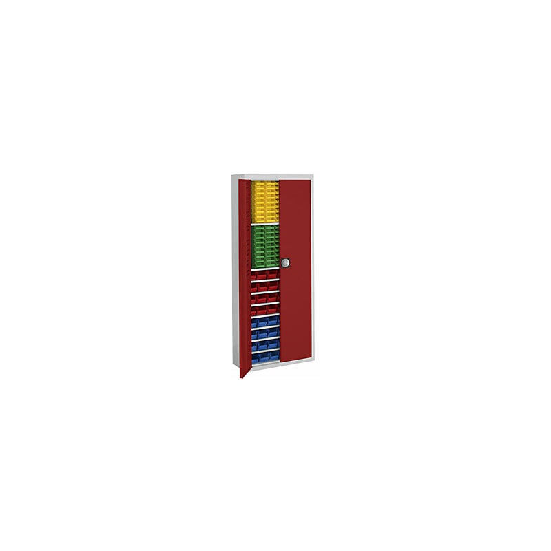 Armadio magazzino con cassette, alt. x largh. x prof. 1740 x 680 x 280 mm, in due colori, corpo grigio, ante rosse, 138 cassettine. Fornitura = montato. Altezza = 1740 mm. Larghezza = 680 mm. Profondità = 280 mm. Struttura = saldata. Materiale = lamiera d'acciaio. Superficie = verniciatura a polvere. Portata totale = 250 kg. Numero ripiani = 9 pz. Materiale ripiani = lamiera d'acciaio, zincata. Portata per ripiano = 50 kg. Passo di regolazione altezza ripiani = 17.5 mm. Cassettine numero / lungh. x largh. x alt. = 24 x blu / 160x100x75 mm, 45 x giallo / 85x100x50 mm, 45 x verde / 85x100x50 mm, 24 x rosso / 160x100x75 mm. Materiale cassettine modulari = polietilene. Colore corpo = grigio chiaro RAL 7035. Colore porta = rosso fuoco RAL 3000. Tipo di porta = anta a battente. Angolo di apertura delle porte = 135 °. Serratura = chiusura a triplo chiavistello con serratura di sicurezza a cilindro con nucleo sostituibile. Numero cassette = 138 pz. Peso = 60 kg. Per attrezzi e minuteria in