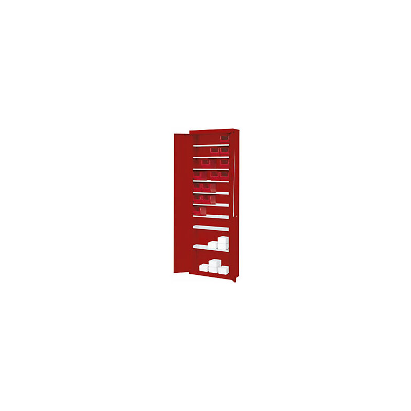 L'armadio magazzino rosso senza cassettine è l'elemento indispensabile per organizzare al meglio il tuo spazio di lavoro. Realizzato in resistente lamiera d'acciaio, questo armadio si distingue per la sua solidità e durata nel tempo. Con 9 ripiani regolabili in altezza e una capacità di carico uniformemente distribuita, potrai organizzare al meglio attrezzi, utensili e materiali. Le ante con cerniere nascoste e chiusura a triplo chiavistello garantiscono massima sicurezza e praticità. Aggiungi un tocco di colore al tuo ambiente di lavoro con questo armadio rosso fuoco dalle dimensioni di 2150 x 680 x 280 mm. Scegli la qualità e la funzionalità per migliorare la tua vita lavorativa!