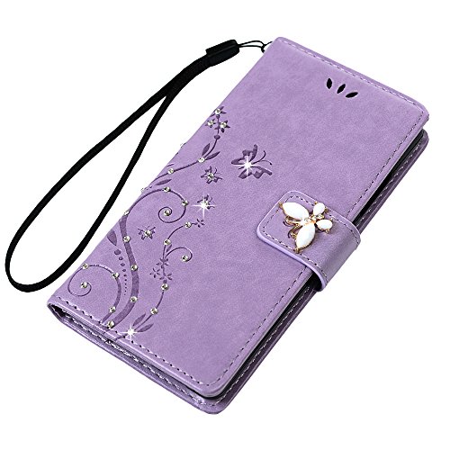 Mavis's Diary Huawei P8 Lite Cover Luce viola, Glitter Bling 3D DIY Diamonte Fatto a Mano, Retro Fiore Modello Stampata Design Con Cinturino da Polso, Magnetico Snap-on Book Style Internamente Silicone TPU Case Protettiva Pelle Folio Flip Custodia - Goffratura Arts Farfalla Fiore (non per versione 2017)