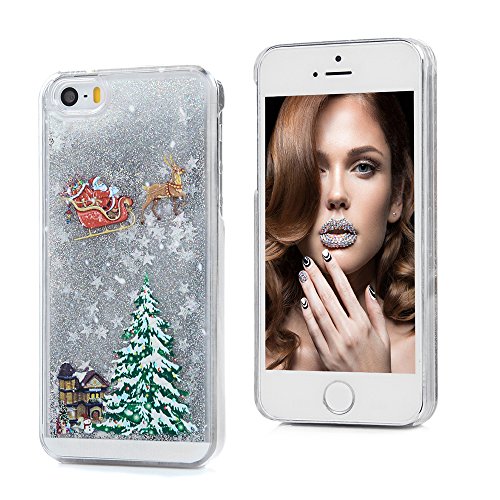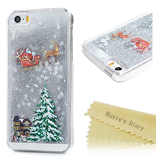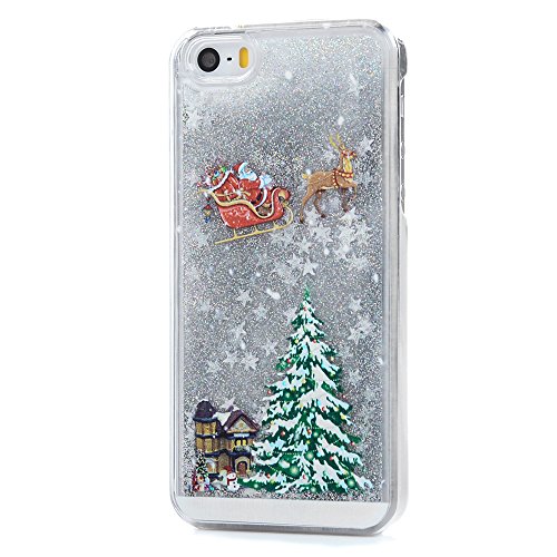 Mavis' s Diary iPhone se custodia, iPhone 5S custodia, iPhone 5 custodia - 3D Bling fluente liquido design albero di Natale Santa Claus riding Sled modello trasparente custodia rigida PC Cover - Golden Liquid e stelle dorate