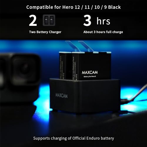 MAXCAM Caricabatteria doppio con cavo USB di tipo C per GoPro HERO12/HERO11/HERO10/HERO9 Nero Enduro Batteria