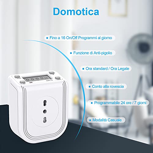 ⏰【Programmazione Flessibile】-- La presa programmabile 24 ore / 7 giorni può essere utilizzata per accendere / spegnere automaticamente luci ed elettrodomestici fino a / 3680W. Fino a 16 diversi programmi ON e OFF al giorno. ogni programma definito viene ripetuto una volta alla settimana.