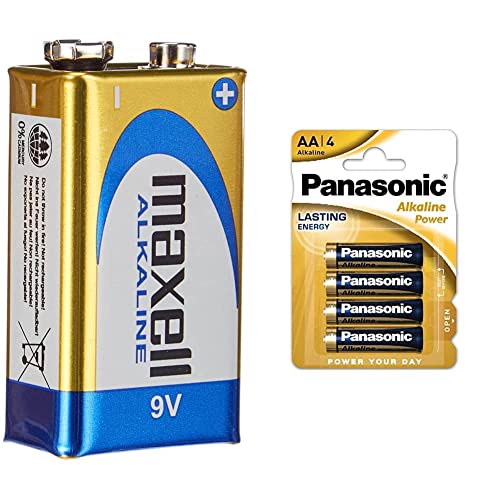 Maxell 6LR61-MN1604, Pila Transistor 9V & Panasonic LR 6 Alkaline Power, Batteria AA, 1.5 V, 4 Pezzi