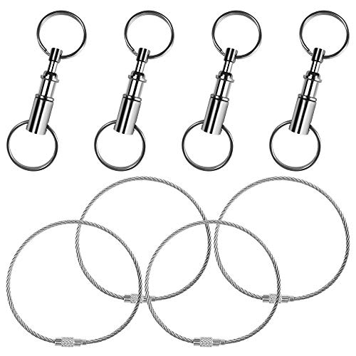 Maxin 4 cavi portachiavi in filo metallico e 4 portachiavi a sgancio rapido staccabile, portachiavi in acciaio inox per esterni, escursionismo, etichette per bagagli, chiavi e targhetta identificativa