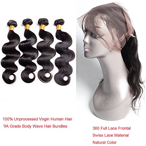Maxine Hair 9A Grade 360 Lace Frontal Closure with 3 Bundles Malaysian Body Wave Virgin Hair Bundles with 360 Lace Frontal Unprocessed Human Hair with 360 Frontal(10 10 10+10 360frontal, Natural Color)