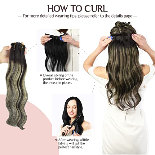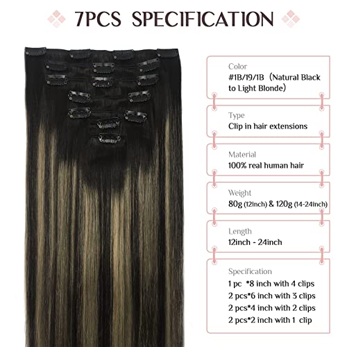 MAXITA Extension Capelli Veri Clip,45cm 7 Pezzi 120g Balayage Nero Naturale a Biondo Chiaro, Extension Capelli Veri Clip in Capelli Umani Remy Capelli Lisci Spessi per Donna