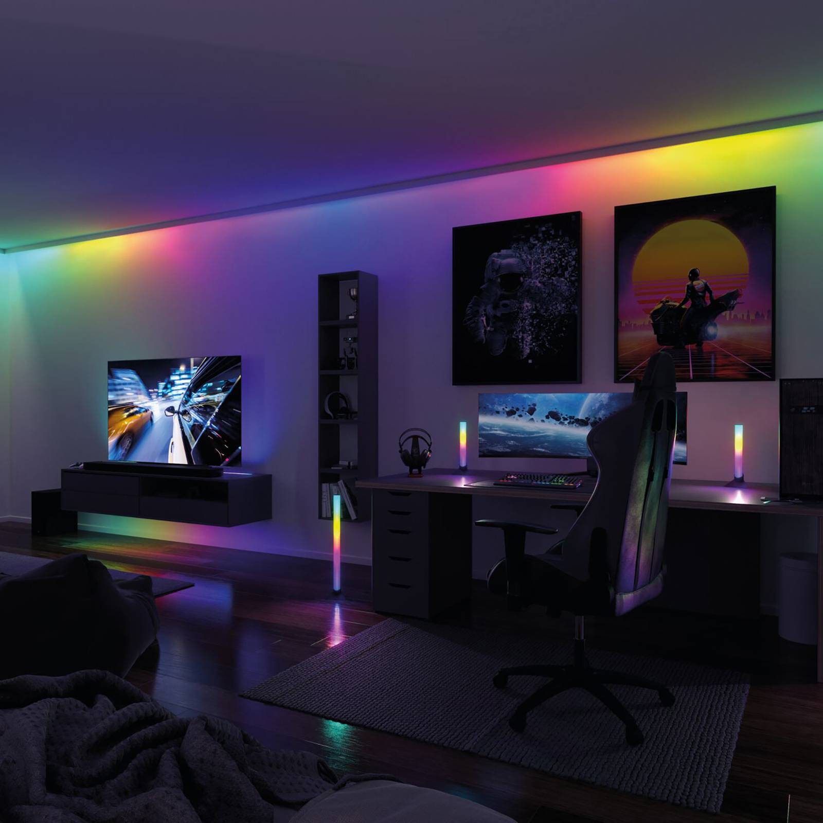 MaxLED Comfort Set TV - set di retroilluminazione per il televisore La retroilluminazione colorata del televisore diventa un gioco da ragazzi con il Comfort Set Max LED 250 di Paulmann. Il set è composto da quattro strisce LED, quattro connettori angolari, cavi di collegamento e un telecomando. L'alimentazione può essere fornita tra le quattro strisce in tutti e quattro gli angoli. Grazie all'alimentazione propria della retroilluminazione a LED, la luce può essere accesa indipendentemente dal televisore. L'illuminazione colorata o la luce bianca, l'attenuazione dell'illuminazione o persino i cambi di colore possono essere comodamente impostati utilizzando il telecomando in dotazione. - autoadesivo sul retro per un facile montaggio - ideale per i televisori sospesi