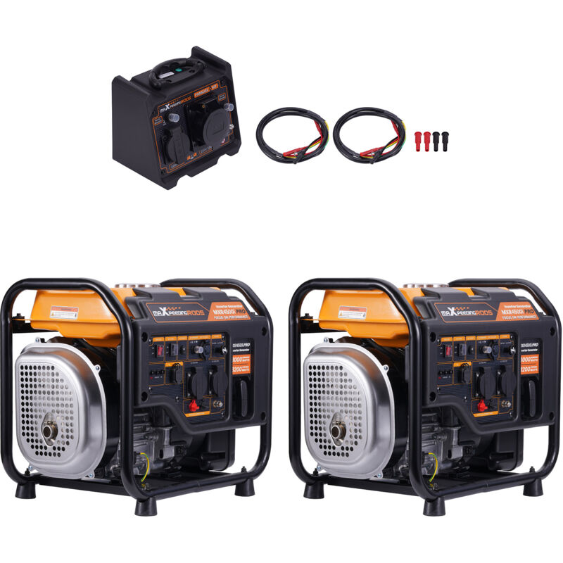 2x 3000W Inverter Stromerzeuger Stromgenerator Notstromaggregat Generator Benzin 4-Takt OHV und Parallelschaltbox 32-Amp Technische Daten - Stromerzeuger • Dauerleistung (Watt): 3000W • Maximale Leistung (Watt): 3200W • Leergewicht: 23.5kg • Betriebsart: Benzin (empfohlen:Bleifreies Benzin) • Öltyp: 10W30 (empfohlen) • Hubraum: 145cc • Spannung: 230 V / 50 Hz • Schallpegel:66dB(no load) • Betriebsstrom:13A • Spitzenstrom:13.9A • Motor-Bauart: 4 Takt OHV Motor • Tank-Kapazität:8.5L Liter • 50%-ladung-Laufzeit:14h • Viertelladung-Laufzeit: 9h • Maße (Lx B x H): 48×34,5×42,7cm • LED-Warnung bei niedrigem Ölniveau: Ja • Überlast-LED-Alarm: Ja • Output Ready LED Alarm: Ja • Eco-Modus: Ja • Parallelfunktion: Ja Parallelschaltbox Zubehörtyp: Wechselrichter-Generator Leistung: 3500W * 2 Verkaufsstellen: 1 x 230V 32A Steckdose 1 x 230V 16A Steckdose AC-Leistungsschalter: 1 x 32 Ampere 1 x 16 Ampere Volt AC: 230V