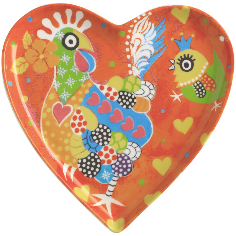 Piatto A Cuore 15.5cm Love Hearts Chicken Dance Questo piatto Love Hearts nasce dalla collezione di Donna Sharam, è un calco di creature affascinanti che portano grandi sorrisi e giocosità nella tua casa, questo piatto a forma di cuore è ideale per condividere snack, dolci e porzioni con gli amici. E' un piatto ispirato allo streetwear e all'arte murale, con un tocco di natura cool, dai colori brillanti. Caratteristiche: Arreda in modo ricercato ed esclusivo la tua tavola, adatto anche ad un uso quotidiano. Misure: 15.5 cm Materiale: Porcellana Adatto al microonde Lavabile in lavastoviglie
