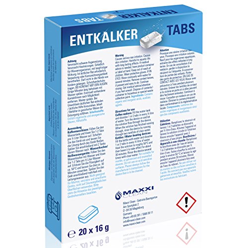 Maxxi Clean 20 pastiglie anticalcare, detergente anticalcare e pulitore multiuso per la pulizia di macchine del caffè del distributore automatico, Senseo, Tassimo, bollitori e lavatrici 1x 20