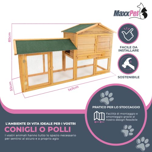 MaxxPet Gabbia per conigli. Dimensioni: 145 x 53 x 85 cm. Casetta per conigli da esterno a due piani. Robusto recinto per conigli, galline o roditori con cassetto per la pulizia