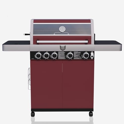MAXXUS babecue a gas BBQ CHIEF 9.0 rosso, manopole a LED, 4 fornelli principali da 14 kW, fornello laterale da 3,5 kW, cappa a doppia parete con inserto in vetro.