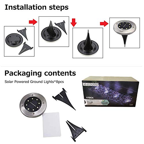 MAXYOYO, 8 luci da Giardino a 8 LED, alimentate a energia Solare, per Scale, Paesaggio, Strade, laghetti, aiuole, impermeabilità IP65, in Acciaio Inox con sensore di Luce, Bianco Caldo