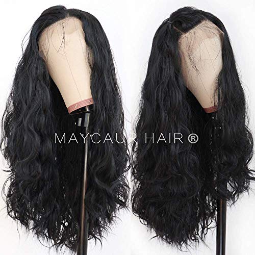 Maycaur - Parrucca lunga con capelli neri e ondulati, senza colla, resistente al calore, in pizzo sintetico per donne nere